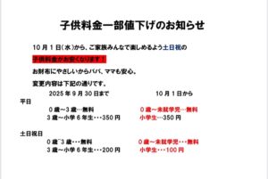 子供料金一部値下げのお知らせ📢 2025.10.2 10月1日から子供料金がお安くなります🌟 ・平日・・・0歳~未就学児→無料 小学生→350円 ・土日祝・・0歳~未就学児→無料 小学生→100円 ご家族みんなでお楽しみください♨ 投稿ナビゲーション いもゴリラ朝市 開催のお知らせ📢10月10日 「銭湯の日」ご案内📢
