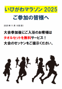 11/9(日)いびがわマラソン2025のお知らせ📢 2025.11.7 11/9(日)にいびがわマラソン2025が開催されます🥳 大会の参加後にご入浴のお客様には、 【大会のゼッケンのご提示で】タオルセットを無料サービスいたします!👀 マラソンの汗をさっぱり流しに、ぜひお立ち寄りください!! 投稿ナビゲーション 【11月】アウフグース開催のお知らせ📢【11月14日】アウフグース開催のお知らせ📢
